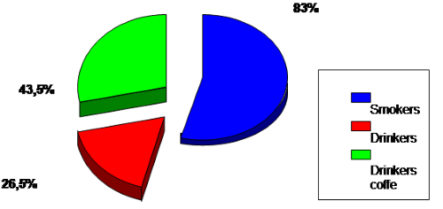 The group of smokers was the largest with 83% (122 cases), followed by coffee drinkers with 43.5% (64 cases) and, to a lesser extent, alcohol drinkers with 26.5% (39 cases) as shown in Figure 2.