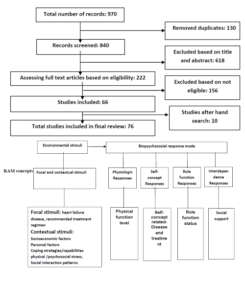 The search results were reviewed by two researchers based on topics and repetitive articles were deleted while reviewing the topics. Then, abstracts of selected articles were retrieved and considering the inclusion and exclusion criteria, were investigated. In this analysis, studies concerned patients with HF who were 18 years old or older, and in terms of severity of illness in Class I-1V were classified as NYHA or patients with HFrEF, HFpEF, and HFmrEF. Also, studies that have examined one or more components of adherence to treatment and adherence to treatment is the main consequence of the study, results were reported quantitatively and qualitatively were investigated. Editorials, letters to the editor or summaries of conferences were considered as exclusion criteria and subsequently, the original articles were examined based on their relationship with the purpose of this analysis and related studies were selected. Manual search of related resources was also carried out and eventually, 76 studies were investigated (Figure 1).