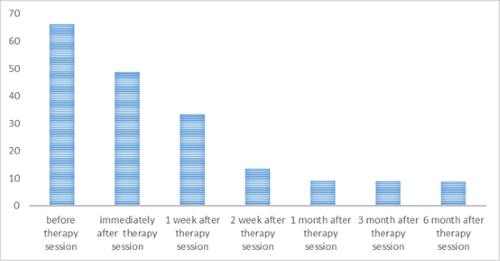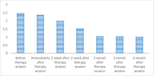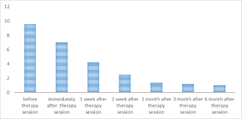 The descriptive statistics of the study variables were represented in the Table 1 before and immediately after each therapy session, and after1 week, 2 weeks and 3 and 6 months of the first session.