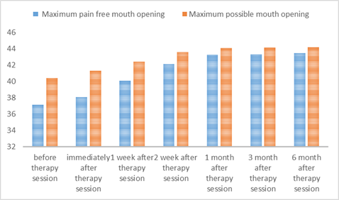Before the first session, the maximum mouth opening and maximal pain-free showed the least levels, but after the first session, statistically significant results were achieved in the mentioned study parameters as the related values increased and continued to be raised, and finally, after 6 months of the first session, they approached to the maximal limits (Figure 3). The raised levels for the mentioned parameters were significant statistically immediately after 1 week, 2 weeks, and 1 month of the first session (p<0.05), but after three and six months, no significant differences were reported for these parameters (p<0.05).