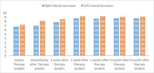The mean values of right and left lateral movements were at the least limit before the first therapy session, but after that, the mentioned levels significantly decreased (p<0.05) and continued to increase non-significantly during sessions (Figure 5).