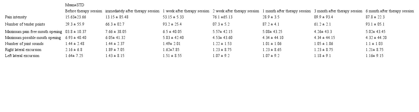 Some parameters were determined, including pain intensity, the number of tender points, joint sound, maximal pain-free, and the maximum mouth opening, and right and left lateral movement, before and immediately after each therapy session, and after 1 week, 2 weeks, 1 month, 3, and 6 months of the first session.