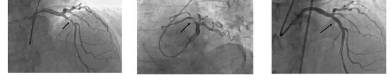 After confirming the presence of coronary heart disease and due to the high volume, mass, and concentration of calcium in a single artery (310 UH in ADA), added to the symptoms and risk factors, cardiac catheterization was performed with the finding of a 90% injury in ADA proximal segment, good distal vessel (see left and center images, in Figure 6). For this reason, the coronary angioplasty and coronary stent implantation processes were carried out, which were carried out successfully (see right image in Figure 6). It is important to note that since the procedure was carried out to date, the patient remains asymptomatic.