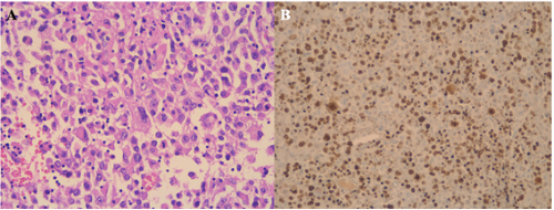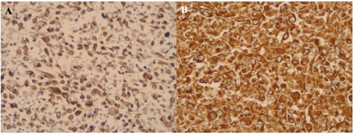 Figure 3. Immunohistochemical characterisation of the neoplasm. A. Positive staining for cytokeratin AE1-A3 demonstrating its epithelial origin. B. Positive vimentin staining.