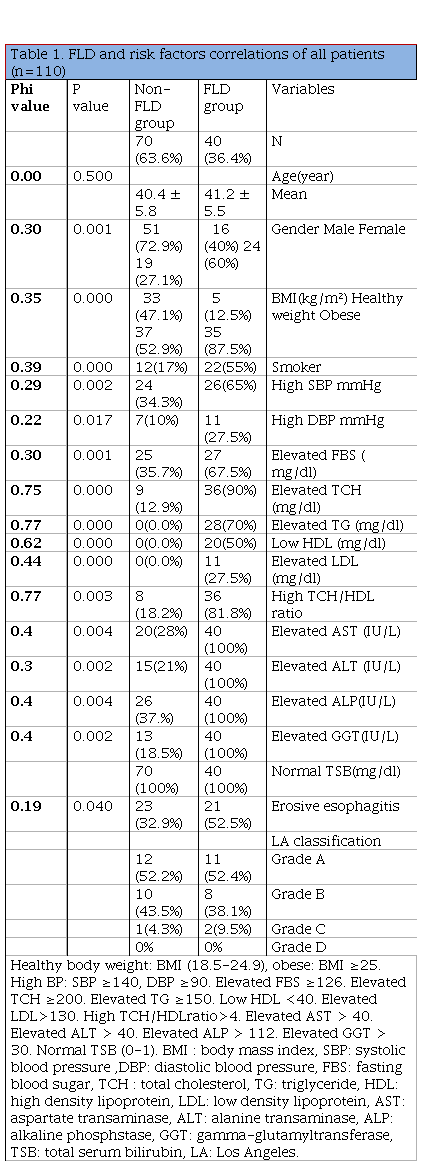 FLD and risk factors correlations in all patients (n=110) are illustrated in table 1. Among 110 patients, 40 (36.4%) were arranged as FLD group and 70 (63.6%) were arranged as non-FLD group. The mean age in FLD group was 41.2 with SD 5.5, and in non-FLD group was 40.4 with SD 5.8, there was no significant correlation between age and FLD, also, there was no recognized increase in FLD with age.