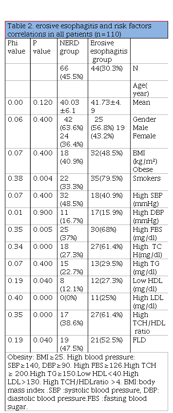 Erosive esophagitis and risk factors correlation in all patients (n=110) as illustrated in table 2. All patients again arranged into two groups, erosive esophagitis 44(40%), and NERD 66 (60%). There was no significant correlation between the age and erosive esophagitis, and there was no recognized increase in erosive esophagitis. There was higher prevalence of male than female in both erosive esophagitis and NERD, with male to female ratio 1.3:1 in erosive esophagitis and 1.75:1 in NERD, but there was no significant association between erosive esophagitis and gender. Significant association was found between erosive esophagitis and smoking, but was not so with BMI, SBP, DBP, FBS and TG. There was significant association between erosive esophagitis and each of high TCH, low HDL, high LDL, and elevated TCH/HDL ratio. There was significant correlation between erosive esophagitis and FLD.