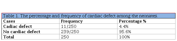 From the total 250 neonates only 11 (4.4%) having cardiac defect. As seen in table-1.