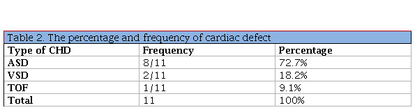 Among the neonates who have cardiac defect that 8 (72.7%) of them have ASD, 2 (18.2%) of them have VSD, and 1 (9.1%) of them have TOF, as seen in table-2