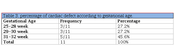 Prevalence of CHDs 4.4% was significantly higher than the reported birth prevalence of CHDs in term neonates 0.6 – 1% (6-10/1000 births)12,13. Importantly, the subset of severe CHDs were almost five-fold more likely in very/extremely premature neonates when compared with term neonates. and 7.4/1000 birth hospitalizations in pre term infants in other study15, the current study found that the most frequent cardiac defect is ASD 72.2 % and least frequent is TOF 9.1% and this correlate with the other studies15. And this indicate that a cyanotic CHD are more common that the cyanotic, regarding the frequency of CHD according to the gestational age (45.6% at 31-32 weeks, 27.2% at 25-28 weeks and 27.2% at 29-30 weeks GA). These data highlight the substantial differences that small increments of prematurity can have on outcomes in neonates with CHD, and may influence future decisions surrounding surgical interventions, medical management, and palliative care15.