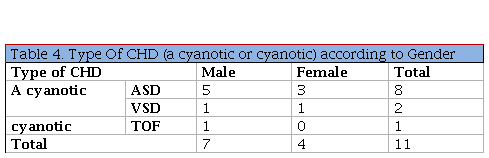 the relationship between the type of CHD and the gender, the male to female ratio was 1.7: 1, as seen in table-4.
