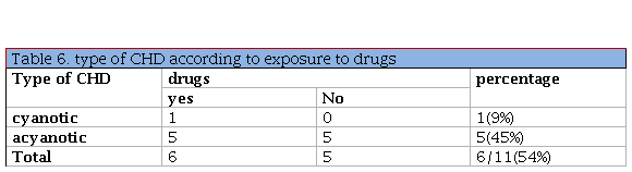 The most common cardiac defect noticed in neonates whose mother taken drugs, was a cyanotic CHD 5(45%) than cyanotic type, as seen in table-6