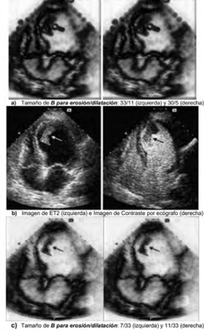 · La morfología matemática (erosión + dilatación + transformada de copa de sombrero blanco) y la similaridad permiten simular el pos-proceso de realce digital, de una imagen de ET2, como una alternativa más económica comparada con la realización de la ecocardiografía de realce físico.