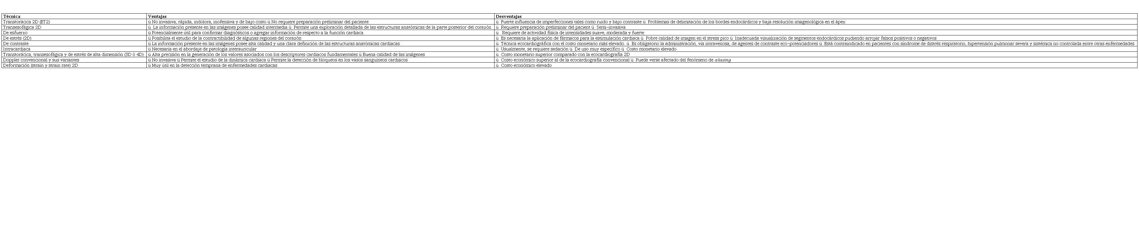 Ante estos problemas de la ecocardiografía transtorácica, aplicando diversos adelantos tecnológicos, se han desarrollado algunas variantes de ecocardiografía que, lógicamente, buscan atenuar el impacto de ellos en la calidad de las imágenes. En este sentido, la tabla 1, de manera comparativa destaca los pros y contras de cada una de las principales técnicas ecocardiografía reportadas en la literatura 8,9,10,11,12,13