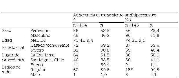 La edad promedio tanto en el grupo de adherentes y no adherentes, osciló entre los 71 y 74 años. El sexo femenino y los que viven en una relación de pareja demostraron ser más adherentes al tratamiento antihipertensivo y se evidencian que la mayoría de los pobladores que presentan un estilo de vida regular evidenciaron ser adherentes al tratamiento antihipertensivo. Por último, en relación con las variables, las únicas que tuvieron relación significativamente con la adherencia al tratamiento antihipertensivo fueron las variables sexo y estilo de vida.