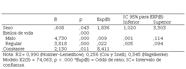 A través de un análisis de regresión logística multivariada se extrajeron los factores independientes predictores de la adherencia al tratamiento antihipertensivo, quedando incluidos en el modelo los factores: sexo y estilos de vida (ver tabla 3), que explicaba el 34,5% de la varianza, según el índice de Nagelkerke, con un porcentaje de corrección de la clasificación del 74%, con un punto de corte establecido en 0,50.