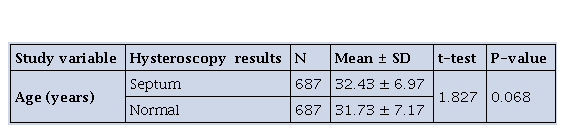 Table 1 shows mean differences of age (years) according to hysteroscopy results including (Septum or normal). There were no significant differences between means of age according to hysteroscopy results.