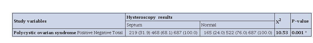 Results: There were no significant differences between means of age according to hysteroscopy results including (Septum or normal) P value 0.068. The percentage of infertile women with septum who had PCOS was (31.9%) which represents 219 women from a total 687 women. There was a significant association between hysteroscopy results and polycystic ovarian syndrome. A higher percentage of PCOS (31.9) was presented among patients with a septum in comparison to (24.0%) among those with normal hysteroscopy P-value 0.001.