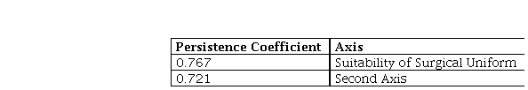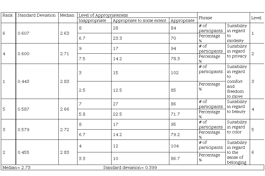 The median of appropriateness in regard to comfort and freedom of movement was (2.83), which means that the surgical uniform is appropriate. The median of decency in relation to the sense of belonging was (2.83), which means that the surgical uniform is appropriate. The median of propriety regarding color was (2.72), which means that the surgical uniform is appropriate. The median of appropriateness about privacy was (2.72), which means that the surgical uniform is appropriate. The median of appropriateness in regard to beauty was (2.66), which means that the surgical uniform is appropriate. The median of appropriateness concerning modesty was (2.63), which means that the surgical uniform is appropriate. The overall median (2.73) suggests that phrases in this axis are appropriate.