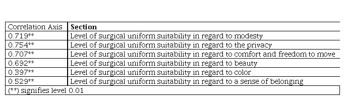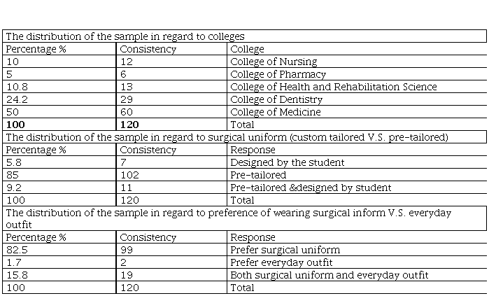 A newly developed questionnaire was used in this study. The questionnaire included investigating the student's current use of the surgical uniform, including how frequently the student wears it and in what places, the number of uniforms the student has the uniform cost, and source, reasons behind choosing to wear the surgical uniform, the type of uniform the student wears, the suitability of the surgical uniform to the kind of work and its attractiveness, the suitability of the surgical uniform to the student: in term of modesty, privacy, comfort, beauty, color and sense of belonging to the students' colleges. The questionnaire was pilot-tested on a sample of 30 students of the target population; The Persistence Coefficient based on the Cronbach's Alpha equation (described in table 2) was ranging from 0.721 to 0.767.