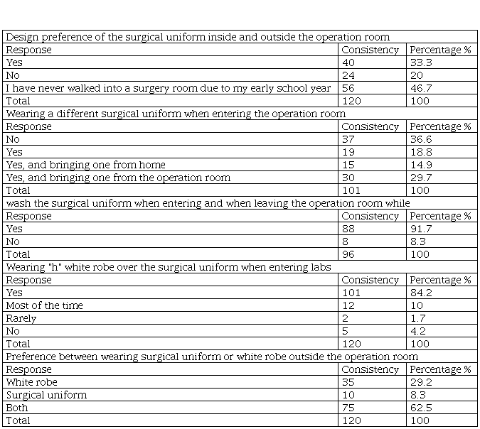 A prospective cross-sectional study was conducted between October 1, 2017 - July 1, 2018, at Princess Nourah bint Abdulrahman University. A sample of 120 students from the health colleges participated in this study. The participants were requested to complete a questionnaire that investigated the participants' current use of the surgical uniform (scrubs) and their attitude toward it. Our institutional review board approved the study prior to data collection.