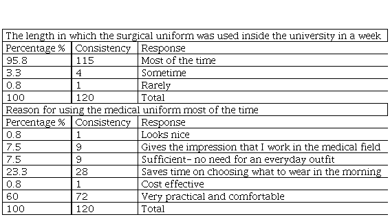 Our current study aims to examine the use of medical clothes as well as to identify the standards of medical clothing as well as the methods used in raising the psychological state of doctors and nursing staff, which in return positively affects their performance. The actual results reached by the study is the design of a set of appropriate fashion for workers in the medical field. Shahin14 on trends youth adopts when selecting their clothes in the college of education quality in the University Banha. Shahin selected a sample of 180 students following a descriptive-analytical methodology. Students trends were measured on a scale of seven dimensions: Conservation, decoration, fashion, self-satisfaction, belonging, punctuality and grabbing others' attention. Results show that the college students lean more toward being conservative taking into consideration social expectation and community values. Being conservative also provide protection when working in laboratories, thus minimizing body exposure to electrical devices or tools that demand flexibility of movement. The trends that the students adopt was divided into two directions: one of them is characterized as belonging to the social and religions teaching, and the call of individual freedom depicts the other. Another study. was looking into the attitude of students toward wearing uniforms for Kufa students in Najaf province. This study differs from previous studies as it aims to identify the reasons that affected the wearing of surgical uniforms among students of health colleges. Results: Most respondents prefer to wear surgical uniforms throughout their time at the university.