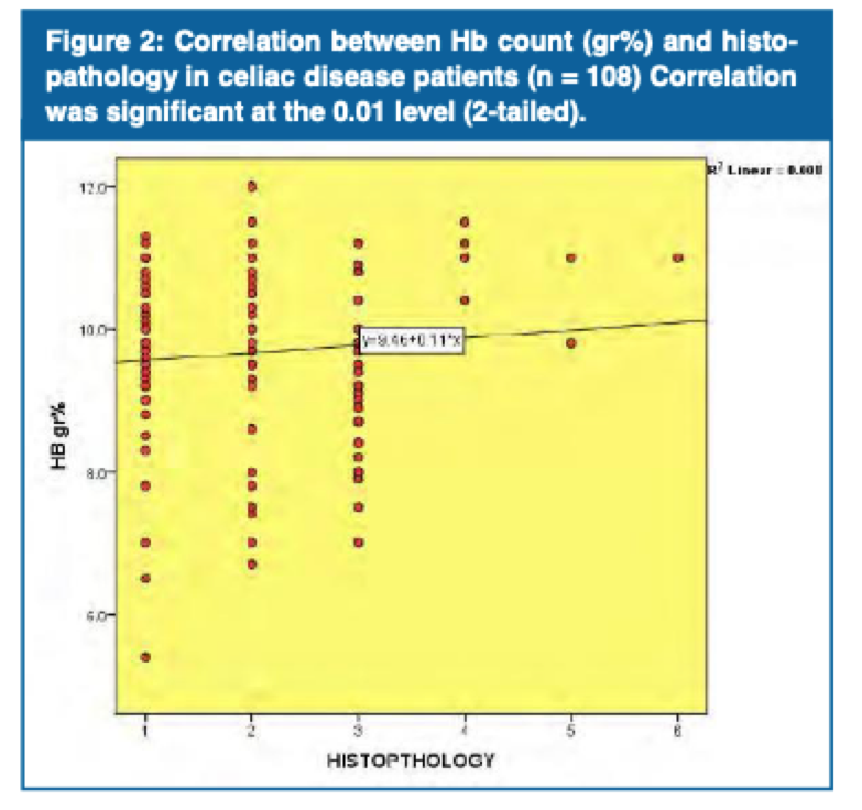 Negatively Correlation (Corr. Coef (r)) of histopathological finding with IDA severity (HB gr %) of CD patients as measured by using "spearman's correlation" (R-0.018; p values 0.000) (Table 3, Figure, 2). There was a weak correlation of histopathological findings with the IDA severity (HB gr %) of CD that determined the grade of anemia of celiac disease patients as measured by using "spearman's Correlation" (R 0.030; P values 0.000) as described in Table 2, Figure 1.