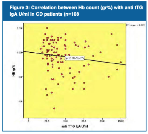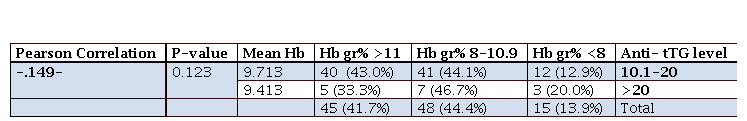 Table 4: Correlation between Hb count (gr%) with anti -tTG U/ml in celiac disease patients (n = 108)