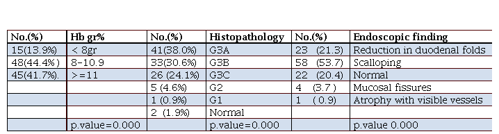 Regarding the Endoscopy, the study showed that 23 (21.3), 58 (53.7), 4 (3.7) and1 (0.9) of CD patients were with a reduction in duodenal folds, scalloping, mucosal fissures, and atrophy with visible vessels respectively while the other 22 (20.4) of CD patients were normal Endoscopy. There was statistically significant between different endoscopic features of CD patients (P-Value 0.000) (Table 1)