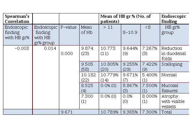 Negatively correlation (Corr. Coef (r)) of endoscopic finding with IDA severity of CD (HB gr %) of celiac disease patients as measured by using a spearman's correlation (R-0.003; P values 0.000) (Table 2, Figure, 1B). There was a weak correlation of endoscopic finding with the IDA severity of CD (HB gr %) the determined the grade of anemia of celiac disease patients as measured by using "spearman's correlation" (R 0.014; p-values 0.000) as shown in Table 2 and Figure 1