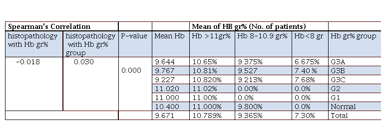 Table 3: Correlation between Hb count (gr%) and Histopathology in CD patients (n = 108)