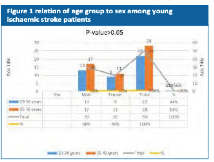 Fifty young patients with ischemic stroke are included in this cross-sectional study. These cases were collected during the period from 1 January to 30 December 2019 for both sexes. They have been seen as an inpatient for new cases and outpatient clinics in Merjan teaching hospital in Babylon city. These patients with age (20-40 years) presented acute neurological deficit (hemiplegia, confusion, speech impairment, etc.) were not recovered within 24 hours (transient ischemic attacks were excluded). They were submitted to detailed neurological history and examination about risk factors, particularly, the cardiac causes. The available investigations (E.C.G., Transthoracic echocardiography and/or Doppler study were performed by using G3 Logic 3 machine model AY15 CUI, CT scan and/or M.R.I.) were done for them accordingly. The data were collected and interpreted in our study about the relationship of risk factors especially cardiac causes and sex distribution to the patients with ischemic stroke, in some data analysis we divided the patients to two age groups: before and after age 35years. The prematurely discharged patients before completing the investigation and death of others mode them were excluded from the study. The statistical analysis was done by chi-square, and P-value was at the level of significance 0.05.