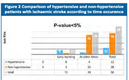Ischemic stroke patients with early morning events were 8 (16%) hypertensive patients and 3 (6%) non-hypertensive patients compared to 4 (8%) hypertensive patients and 35 (70%) non-hypertensive patients with events occurring at other times as in figure (2).