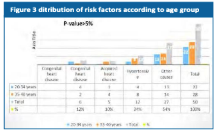 In age group (20-34) years, they were 4(8%) patients with congenital heart disease, 1(2%) case of acquired heart disease, 4(8%) cases hypertensive, 13(26%) cases due to other causes of stroke. These compared to age group (35-40) years with 2(4%)cases of CHD, 4(8%)acquired heart disease, 8 (16%)cases hypertensive and 14(28%)cases due to other causes as in the following Figure (3).