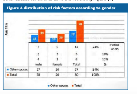In sex distribution to risk factors for stroke, the males were 4 (8%) CHD, 2(4%) acquired heart disease, 7(14%) hypertensive patients and 17(34%), 3 (6%) acquired heart disease, 5(10%) hypertensive and 10 (20%)cases due to other causes for stroke, as in the following Figure (4)