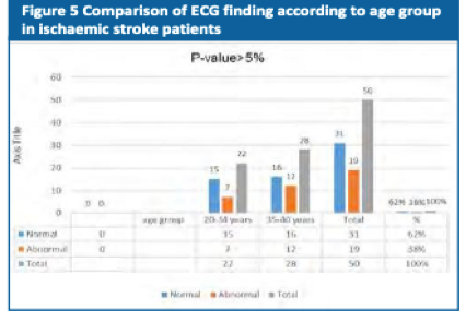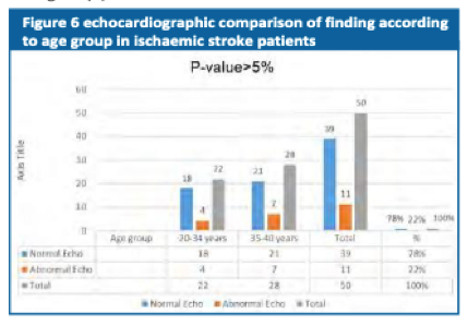 In our study, found that 14% of cases had abnormal E.C.G. below age 35 and 24% of cases had abnormal E.C.G. above 35 years where it was collectively 34% of cases in our study which is consistent with the Ziegler’s study. In the echocardiography study, we found that 8% of cases with ischemic stroke had abnormal echo finding below age 35 years, but above age 35 years, we found that 14% of cases had abnormal echo study (wall dyskinesia, septum thickening, thick wall, abnormal valve lesion). This explains the increase in the incidence of impaired cardiac function with increasing age due to the effect of risk factors (see figure 5 and associated table).