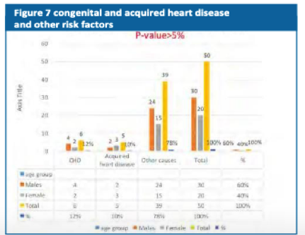 They were 4(8%) cases with congenital heart disease (CHD) males, 2(4%) cases with acquired heart disease and 24(48%) cases due to other causes for stroke. All of these were compared to females with 2 (4%) cases CHD, 3(6%) cases acquired heart disease and 15(30%) cases due to other causes for stroke. Acquired causes include 1(2%)mitral stenosis,1 (2%) mitral valve prolapses, 2(4%) cardiomyopathy, 2(4%) atrial fibrillation due to cardiac causes and 1(2%)combined mitral valve disease. All of them were 5 (10%) cases as in figure (7) below.