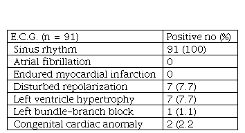 E.C.G. findings in age group (20-34) years, 15(30%) cases with normal E.C.G. and 7 (14%) cases abnormal E.C.G. (arrhythmia, ectopic, etc.). Compared to age group (35-40) years, 16(32%) cases normal E.C.G. and 12(24%) cases abnormal E.C.G. as in figure (5) and associated table below.