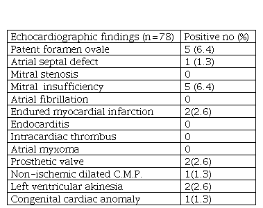 Ziegler stated that recurrence, though often not fatal, causes heavy disability and occurs in 10-15% of young ischemic stroke19. In our study, it was found that 14% of cases had a recurrent stroke, and 8% of all cases were due to cardiac causes. It was also stated in his study that it had been estimated that even stroke-oriented neurologists inadequately investigate one in five young ischemic stroke patients. The major problem appears to be a restriction of investigations to neuroimaging alone, e.g. C.T brain scanning. Additional investigations to be performed in young stroke patients may include M.R.I., M.R.A., antiphospholipid antibody, syphilis serology, drug screen 24-hour E.C.G. recording transesophageal echocardiography and cerebral angiography22. In our study, it has been found that 34% of ischemic stroke had an elusive diagnosis due to the limited facilities in our hospital and city. In other study12 found that Tran esophageal echo more important in detecting congenital causes for stroke 3 folds than acquired causes, and this Figure is highly significant.
