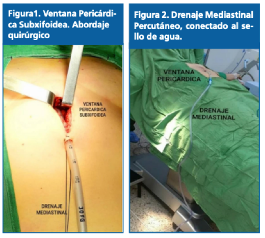 Los cuadros de derrame pericárdico en pacientes con IRC en su mayoría son resueltos con medidas conservadoras, bien sea aumentando el número de hemodiálisis o variando la técnica de la misma. Cuando se presenta un derrame pericárdico severo es necesario el drenaje quirúrgico a través de la ventana pericárdica subxifoidea, lo cual le permite al cirujano un mejor abordaje del mediastino y de la bolsa pericárdica, además de la toma de biopsia de pericardio para hacer diagnóstico diferencial con otras patologías y la localización de un drenaje percutáneo de mayor calibre, lo que permite la cuantificación de forma más exacta a partir del gasto por dicho drenaje. (Figura 1 y 2). También es pertinente mencionar que la persistencia del gasto por el drenaje mayor a 100 mL en 24 horas, por más de 72 horas es indicativo para realizar pericardiodesis.