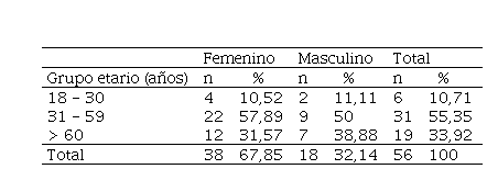 El derrame pericárdico de los pacientes nefrópatas incluidos en el estudio fue resuelto quirúrgicamente a través de la realización de venta pericárdica subxifoidea. De los 56 pacientes, el 67,85% (n=38) fue representado por el sexo femenino y 32,14% (n=18) por el masculino. La edad de los pacientes se ubicó en un ±DE 54,30±17,24 años, presentando una edad mínima de 18 años y máxima de 89 años. En la tabla 1 se observa que la mayoría de los pacientes que presentaron derrame pericárdico y que ameritaron ventana pericárdica, tenían edades comprendidas entre 31-59 años con un 55,35%, seguido de los > 60 años con 33,92% y en tercer lugar entre 18-30 años con 10,71%. En relación al sexo, el femenino fue el más afectado con un porcentaje de 57,89% con respecto al masculino con 50%. (Tabla 1).