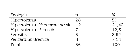 Con respecto la causa del derrame pericárdico severo en los pacientes intervenidos quirúrgicamente, prevaleció la hipervolemia, seguido de hipervolemia + hiperproteinemia, hipervolemia +serositis, serositis y pericarditis urémica. El estudio de Colombo et al.22, analizó a 25 pacientes con derrame pericárdico que fueron enviados para un procedimiento pericárdico invasivo. Las etiologías más frecuentes fueron: neoplásica (36%), idiopática (32%) y urémica (20%). Viñas et al.12, reporta en su investigación que el 80% de los pacientes a los cuales se les realizó ventana pericárdica, el derrame estuvo asociado a diálisis con hipervolemia, ya sea por infradiálisis o sobrehidratación. Ramírez et al.23, evaluaron 62 pacientes con diagnóstico de derrame pericárdico severo; la principal fue la uremia (22,6%), seguida por las neoplasias (14,5%), la pericarditis bacteriana (11,3%) y la pericarditis aguda idiopática (11,3%)22.