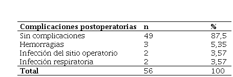 La tabla 4 muestra las complicaciones postoperatorias, la cual se pudo observar que el 87,5% de los pacientes intervenidos no presentaron complicaciones, sin embargo, el 5,35 presentaron hemorragias a través del drenaje mediastinal, y 3,57% mostraron infección en el sitio operatorio e infección respiratoria respectivamente. (Tabla 4).