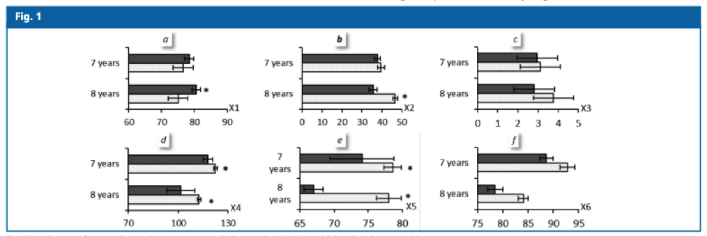 At the first stage of the research, the CVS indicators of girls aged 7 and 8 years were analyzed at relative rest at the beginning of the school week. Also, the age-related dynamics of the parameters was assessed, a comparative analysis was carried out with the data of the control group. It was found that regardless of the state of the visual analyzer, 7-year-old girls have no significant differences in heart rate indicators. In the visually impaired group, it is 78.40 ± 1.30 bpm, and in healthy girls - 76.50±3.04 bpm (Fig. 1a). A similar situation is revealed in relation to SV and CO (Fig. 1b, c), which are 37.75±1.38 ml and 39.50±1.77 ml, 2.95±1.50 L and 3.10±2,80 L in both groups, respectively. The most significant differences are observed in blood pressure indicators: SBP in visually impaired schoolgirls was 117.80±2.90 mmHg, and 122.44±1.07 mmHg in healthy girls (Fig. 1d), which is 4.64 mm Hg. more and mathematically significant (p <0.05). Diastolic blood pressure in children of the control group was also high - 78.60±1.37 mmHg, whereas in schoolgirls with pathology it did not exceed 74.10±4.7 mmHg. (p <0.05) (Fig. 1e). The exception was observed for MP: in both study groups it ranged from 88.60±1.30 to 92.80±1.45 mmHg (Fig. 1f), the differences were not significant.