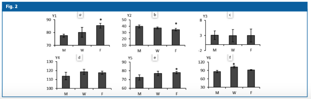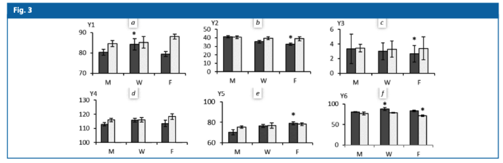 Remark:(a) Heart rate; (b) stroke volume; (c) minute blood volume; (d) systolic blood pressure; (e) diastolic blood pressure; and (f) average hemodynamic blood pressure; Horizontally (abscissa): days of the week: M – Monday, W – Wednesday, F - Friday;