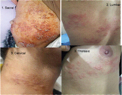 This figure shows samples of skin vesicle samples found in people infected with viral herpes, according to their location in the body and the proportions shown in the above results. These represent each sacral area (1), lumbar (2), cervical 22% (3), and the thoracic region (16%) (4).