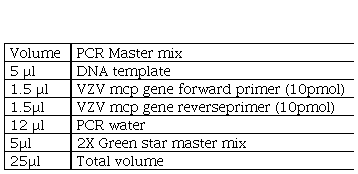 PCR technique was performed on the extracted DNA samples for direct detection of varicella-zoster virus (VZV) primarily based totally on amplification of both glycoprotein type B (gp B) and major capsid protein (MCP) gene in VZV from skin lesions scrap samples. This technique was done according to the technique defined by Aubaid et al.8 and Al-Khafaji et al.9 using two kinds of primers as presented in Table 1.