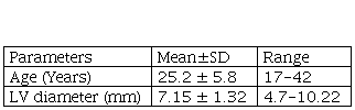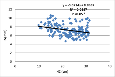 The mean head circumference of the fetuses was 22.7 ±5.6 mm and there was significant correlation between the LV diameter and the head circumference (r, p=0.088, 0.04) (Figure 1).