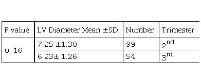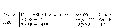 Regarding the association between gender and LV diameter, there was no statistically significant association between them (P>0.05), in which there was 53 female fetuses and 46 male fetuses (Table 3).