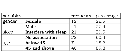 A cross-sectional study of 53 CKD patients with pruritic age 52 ± 6 years old 87% of all patients with age 45 years old and above and 13% of them below 45 years old. 23% of patients are females, and 77% are males, 40% of patients the pruritus interfere with their sleep while 60% do not, as shown in table 1.