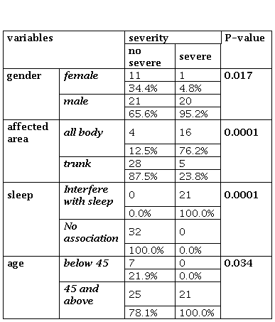 As well as the gender and affected area, there is a significant association between severity of pruritus and sleep, 100% of severe pruritus Interfere with sleep. Moreover, there is a significant association between the severity of pruritus and the age of patients; 100% of severe pruritus occurs at age 45 years old and above, as shown in table 2.